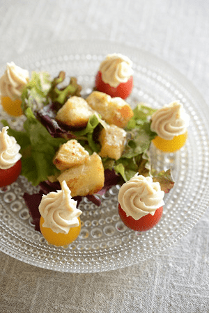 - ヘタを取って上下を少し切り落としたプチトマトに1を絞り、ハーブを飾る。